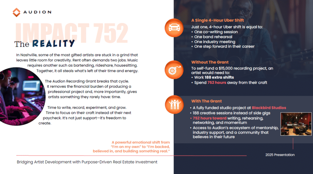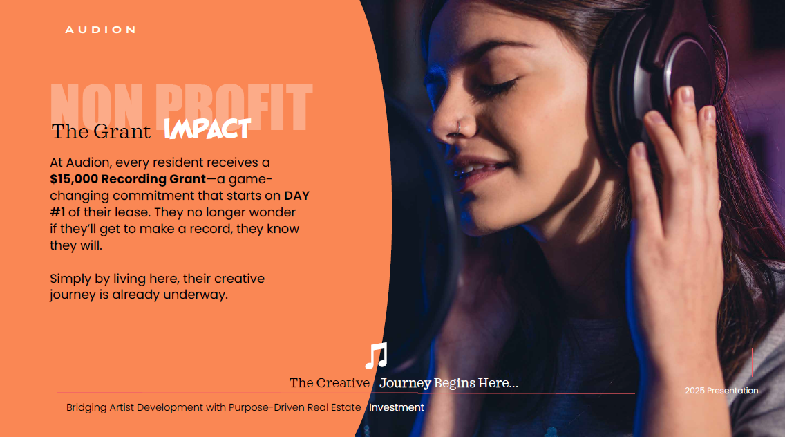Sample “pitch deck” used to help secure funding and support for private venture supporting artists.