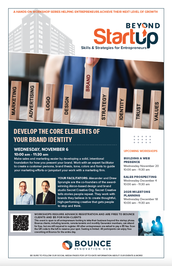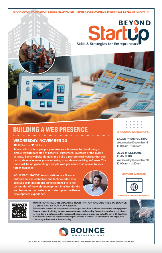 The Beyond Startup Workshops are a series of classes that provide a combination of hands-on and lecture-based learning to increase the overall skillsets of entrepreneurs. These workshops occurred twice a month in the Bounce Innovation Hub. Overall marketing consisted of printed and digital “posters,” paid social media ads, posts/stories, email marketing campaigns, and press releases.