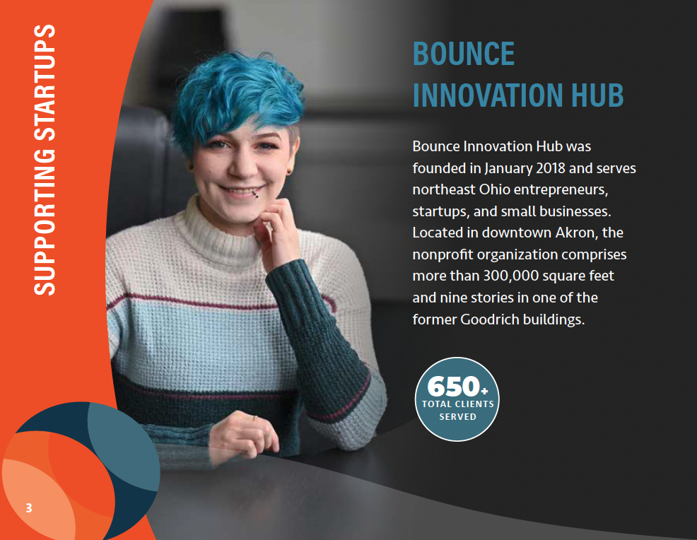Bounce Innovation Hub was founded in January 2018 and serves northeast Ohio entrepreneurs, startups, and small businesses. Located in downtown Akron, the nonprofit organization comprises over 300,000 square feet and nine stories in one of the former Goodrich buildings. Bounce Innovation Hub offers an entrepreneurial experience that is unique to Northeast Ohio.