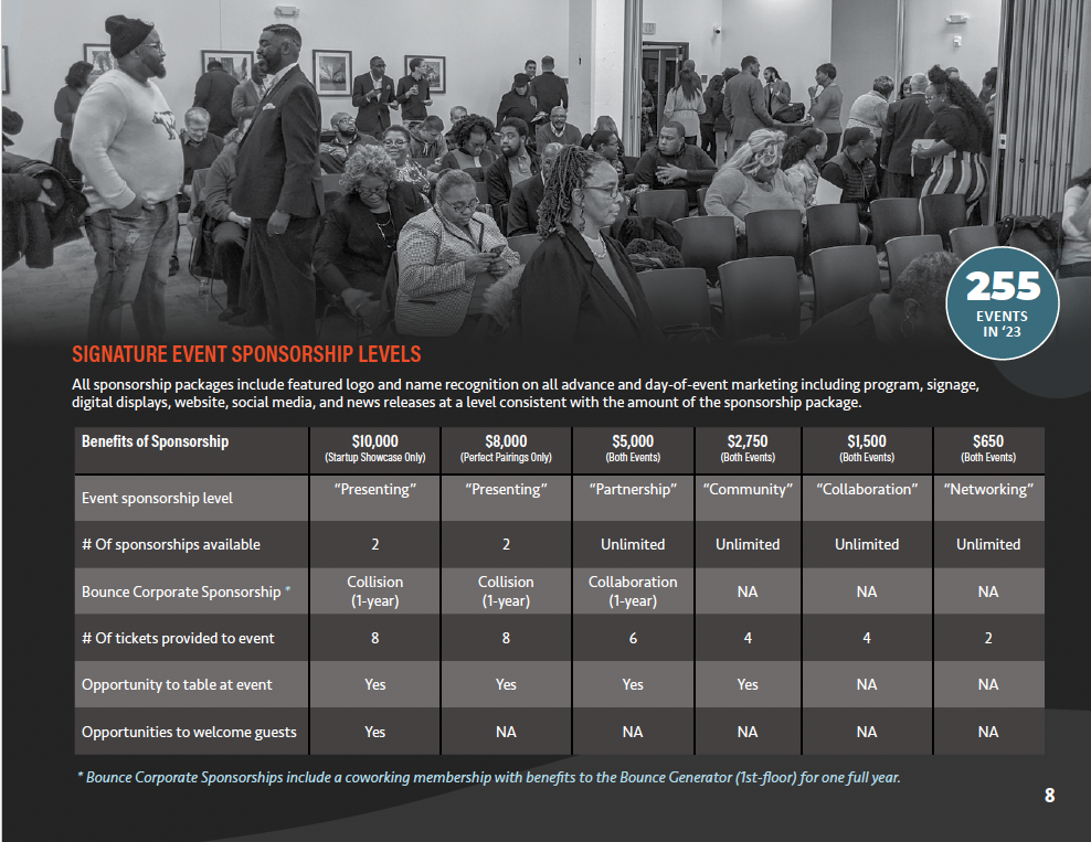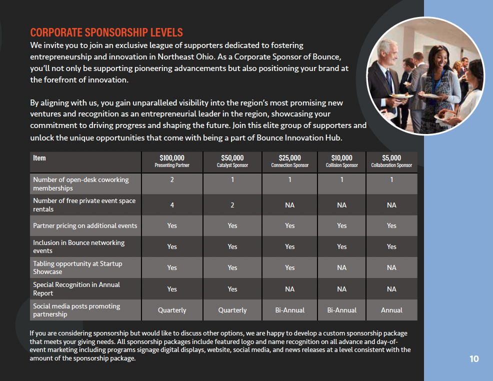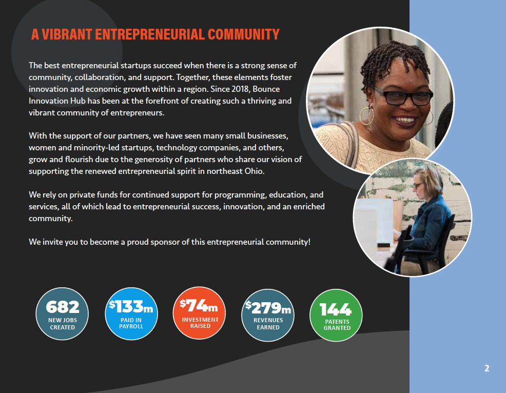 Development and publishing of the 2024 Bounce Innovation Hub Annual brochure to solicit corporate sponsorships for the organization.